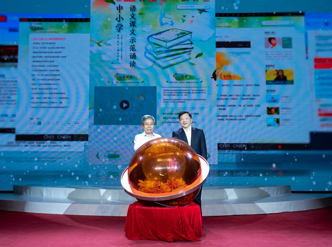 △中宣部副部長、中央廣播電視總臺臺長慎海雄,教育部部長陳寶生共同見證“中小學(xué)語文示范誦讀庫”首批100篇音頻教材正式上線發(fā)布。(攝影:新華社記者 沈伯韓)