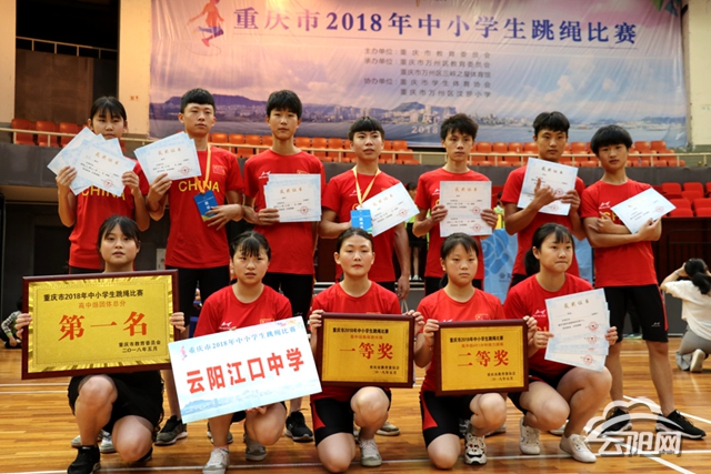 云陽網(wǎng)訊(實(shí)習(xí)生 牟丹)近日,在重慶市2018年中小學(xué)生跳繩比賽中,江口中學(xué)校跳繩隊(duì)榮獲高中組集體跳長繩一等獎(jiǎng)、高中組4x1分鐘接力跳繩二等獎(jiǎng)以及高中組團(tuán)體總分第一名。