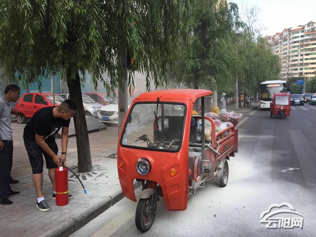 云陽網訊(通訊員 周宇)8月13日上午,云陽縣濱江路上,一輛滿載蔬菜的紅色電瓶車在馬路邊突然發生自燃。兩名駕車上班的民警遇見后,迅速買來滅火器上前救火,僅用3分鐘撲滅。
