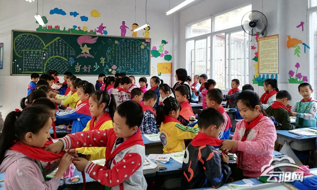 入隊儀式上,全體隊員齊唱《國歌》《少先隊隊歌》;學校大隊輔導員介紹了少先隊的光榮歷史和少先隊的基本知識,并宣讀了437名新隊員名單。在《紅領巾之歌》的音樂伴奏下,五年級的老隊員為新隊員戴上了鮮艷的紅領巾,新老隊員在隊旗下莊嚴宣誓。