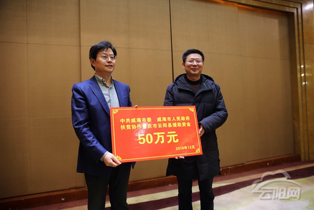 會議現場,威海市委市政府為云陽縣捐贈幫扶資金50萬元。