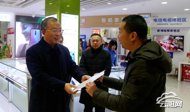 縣委書記張學鋒為中國電信云陽分公司負責人發(fā)放我縣第一份《第四次全國經(jīng)濟普查單位普查告知書》。