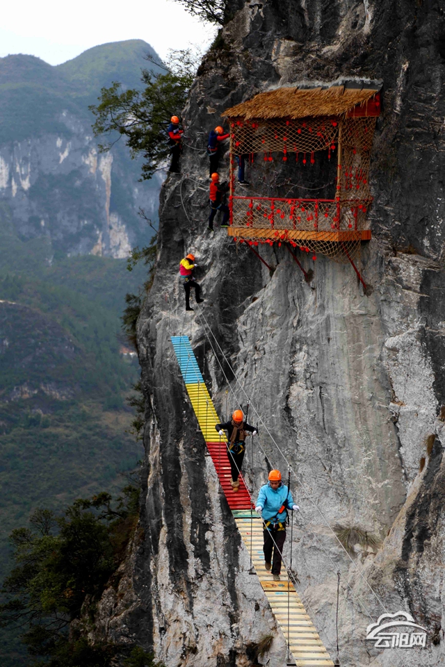 據(jù)項(xiàng)目負(fù)責(zé)人介紹,游客想體驗(yàn)飛拉達(dá)項(xiàng)目,首先穿好安全設(shè)備、在工作人員的指引下進(jìn)行一段距離的懸崖攀爬,然后到達(dá)云端彩橋,走完云端彩橋再攀爬一段峭壁,就可以進(jìn)入緬甸橋,抵達(dá)終點(diǎn)寄情壁,目前,云端彩橋在試運(yùn)營(yíng)期間,體驗(yàn)價(jià)100元/人。除云端彩橋外,龍缸景區(qū)還將在龍缸上空建設(shè)國(guó)內(nèi)首條天坑飛拉達(dá),和云端彩橋交相呼應(yīng),吸引更多游客前來體驗(yàn)。