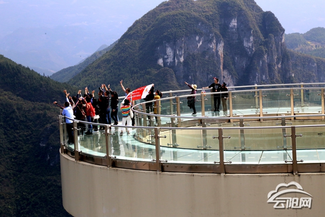 在三峽文物園和張飛廟景區,采風踩線團一行聽著導游的介紹,一邊看一邊拍,一邊贊嘆云陽厚重的歷史底蘊、美麗的自然風光。站在張飛廟內,俯瞰云陽城市夜景,燈光倒映在江面上,波光粼粼,宛如一幅美景畫,采風踩線團的成員們趕緊拿出相機拍下城市的美景。次日,采風踩線團一行來到龍缸,在導游的帶領下,分別游覽了戲猴臺、映月洞、玻璃棧道、廊橋等景點。站在棧道上,一眼望出去,群山延綿,叢林碧翠,山脊一條窄而狹長的小路一直蜿蜒到山頂,山路崎嶇險峻,山林景色幽秀。