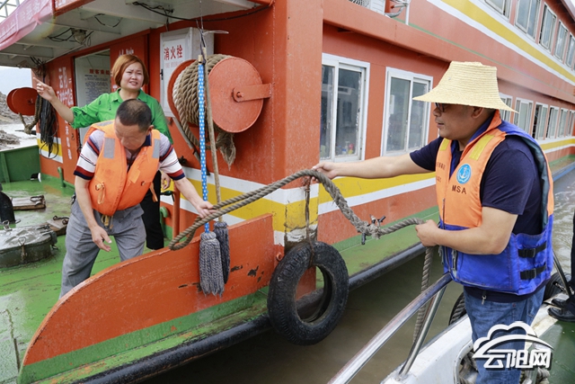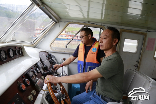 一年365天,袁軍每天都在云陽長江段航行幾十公里,他早上7點半到達碼頭,檢查船舶各種設備,給機艙做衛生,確保船艙干凈、整潔。船只8點半準時從碼頭出發。這段時間正是汛期,而長江里的水位下降快,他們航行的重點工作就是提醒過往船舶遵守水上交通秩序,確保安全航行。在工作中,袁軍用文明語言與過往船只進行交流,提醒船只注意安全。