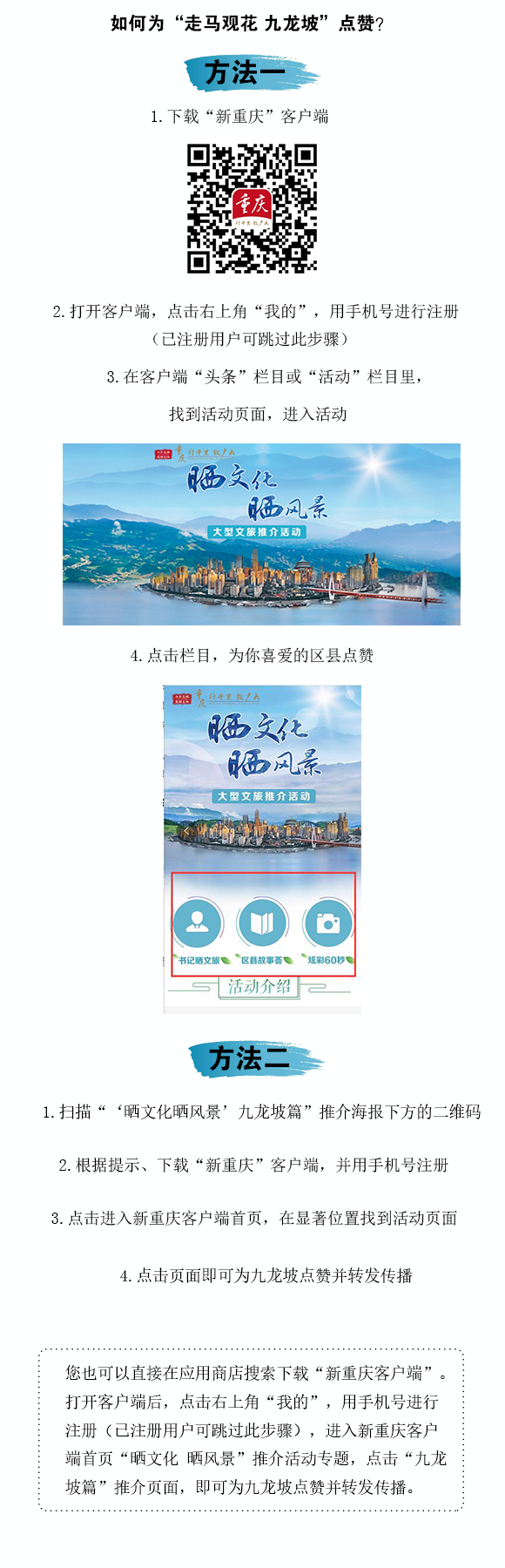 華龍網-新重慶客戶端作為本次雙曬活動的推介展示網絡點贊平臺之一,將集納九龍坡“曬風景 曬文化”三大參賽作品開設網上投票專區(“曬文化·曬風景”九龍坡篇推介投票專題將于7月1日21:30分在“新重慶”客戶端首頁上線),網友可通過下載“新重慶”客戶端觀看投票,為九龍坡這座“江山多嬌城,龍鳳呈祥地”點贊傳播。