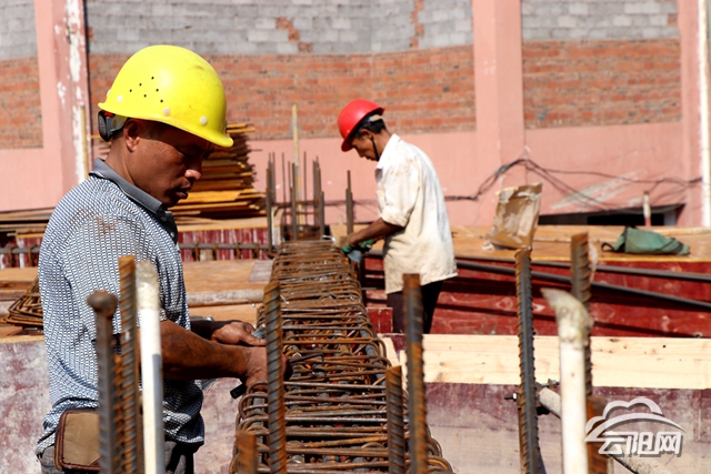 云陽網訊(記者 鄧磊 實習生 劉浮生)7月10日,記者在柏楊灣農貿市場及旅游商品市場擴建工程施工現場看到,建筑工人不懼烈日,堅守在施工現場搭建混凝土澆筑模塊,捆扎鋼筋……
