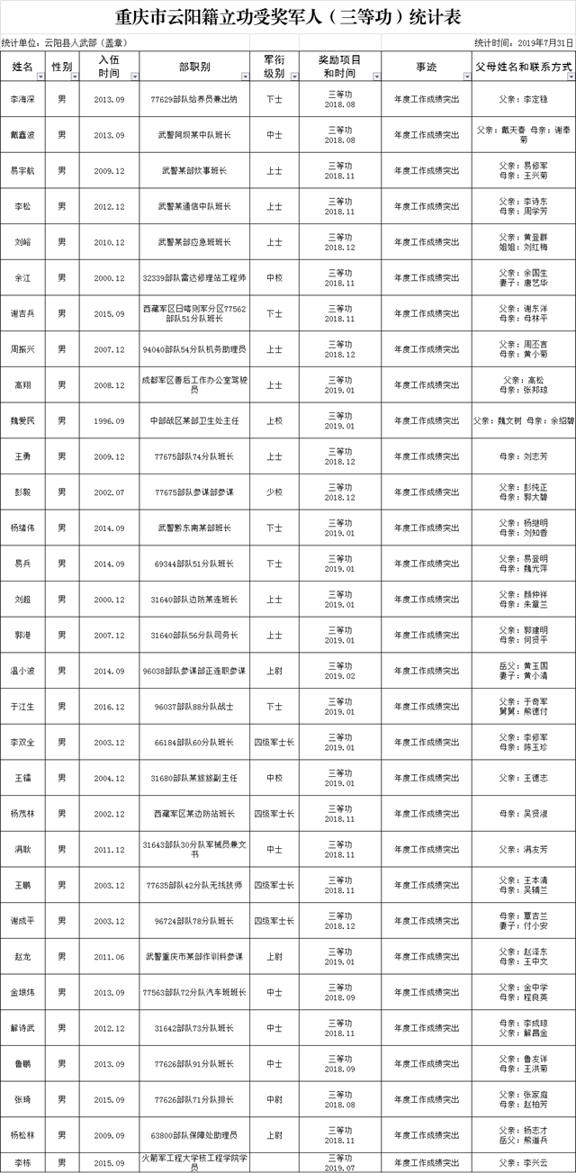 為弘揚(yáng)愛國主義主旋律,匯聚強(qiáng)軍興軍正能量,不斷增強(qiáng)人民群眾的國防觀念和崇軍尚武意識(shí),激發(fā)廣大軍人軍屬政治榮譽(yù)感和官兵立足軍營建功立業(yè)的熱情,在全社會(huì)營造關(guān)心、支持、熱愛、參與國防和軍隊(duì)建設(shè)的濃厚氛圍,值此建軍92周年之際,對(duì)2018年7月至2019年7月期間榮立三等功的云陽籍軍人予以登榜表彰。