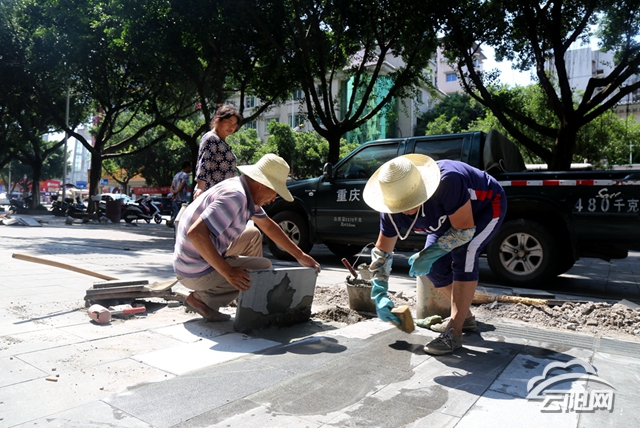 云陽網訊(記者 鄭紅均)8月4日,記者在云江大道發現往日車鬧人雜的人行道上,工人們冒著酷暑正緊張有序地施工,對人行道上破損的路面進行修補。