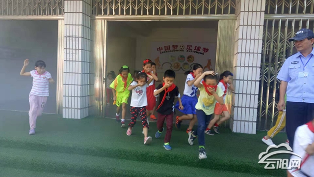 在消防應急疏散演練活動中,學校在安全處放上對人體無害的煙霧彈,模擬學校某處發生初期火災,學校老師組織學生疏散逃生并撲滅“火災”的場景。在老師的帶領下,學生們捂住口鼻,低頭彎腰,井然有序的撤離至安全區域。