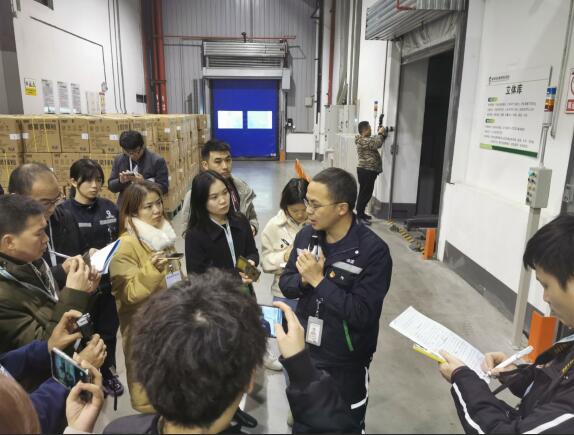 重慶醫(yī)藥和平物流中心負(fù)責(zé)人(中)向采訪團(tuán)介紹智能化設(shè)施。姚於攝