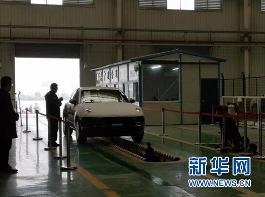 一輛保時捷越野車在重慶整車進口口岸檢測線上接受檢測。新華網 王龍博 攝