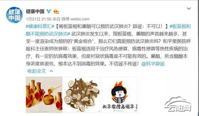 1月21日晚,國家衛健委官方微博@健康中國 對于喝板藍根、熏醋可以預防新型肺炎的說法緊急辟謠。
