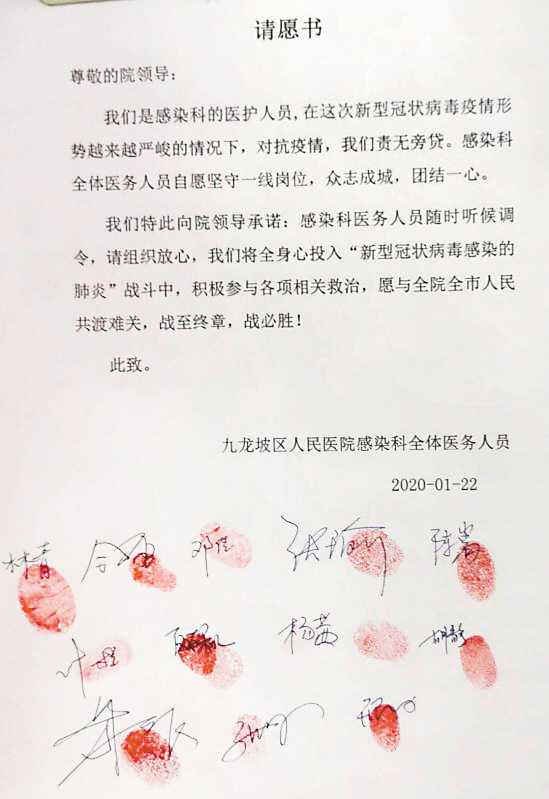 1月22日一大早,鄧佳和團隊成員集體向醫(yī)院遞交了“請愿書”。“感染科全體醫(yī)務(wù)人員自愿堅守一線崗位,眾志成城,團結(jié)一心。”