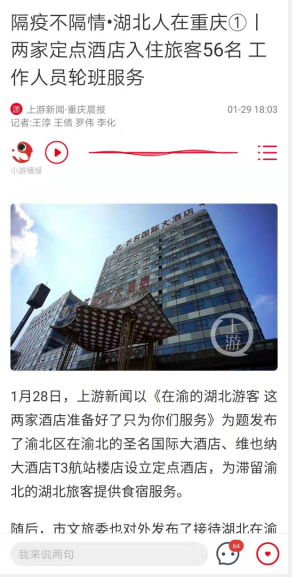 重慶人的周到、熱情、隔疫情不隔溫情的舉措,受到了社會各界,尤其是在渝湖北游客的高度贊揚(yáng)。