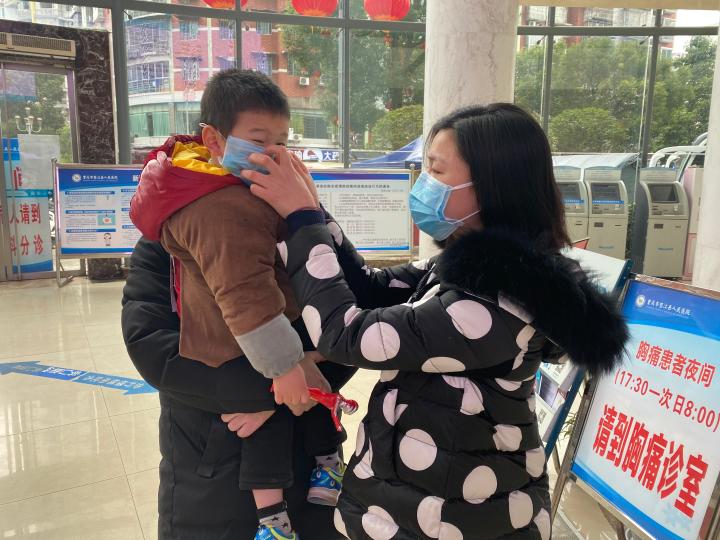 墊江縣人民醫(yī)院大廳里,即將出征的重癥醫(yī)學科江慢和她3歲孩子道別。 受訪醫(yī)院供圖 華龍網發(fā)