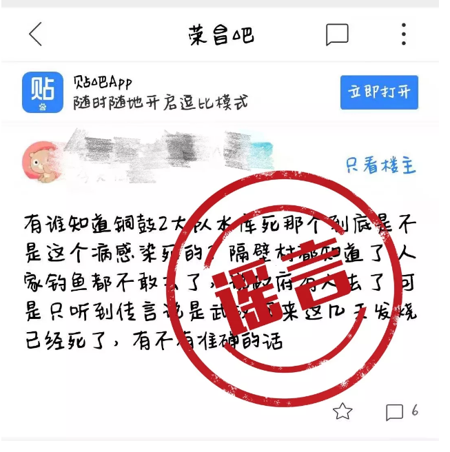 近日,在百度貼吧“榮昌吧”中,有傳言“鼓樓二大隊死者因‘新冠肺炎’感染去世,附近居民人心惶惶”,對此,榮昌區展開核查并發現,該人死于腦梗。