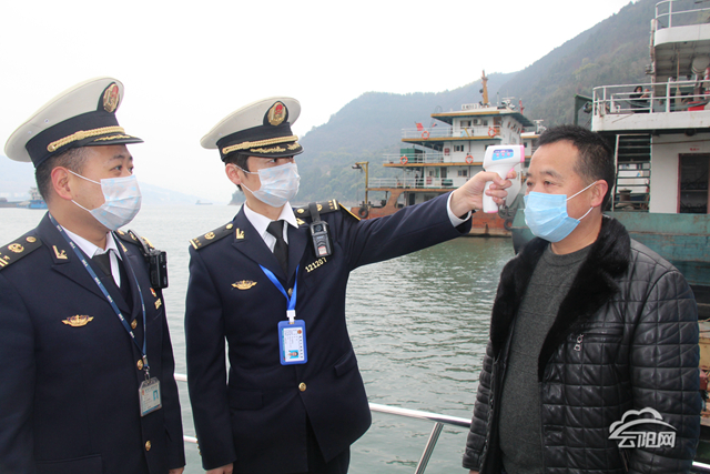 “我們云陽海事處現在的主要任務,是對停泊在盤石的待閘船舶進行防疫監控,每天我們都會對船員進行體溫測量和防疫宣傳,并督促船員做好船上的衛生消毒工作。”云陽海事處新城執法大隊執法人員單斌說,“對于個別有需要的船舶,海事處會定期幫他們運送生活物資和免費發放口罩、消毒水等醫護物資。”