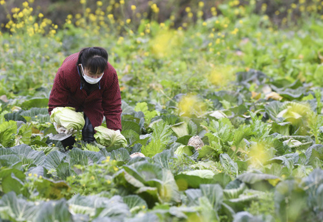↑2月5日,重慶市云陽縣青龍街道馬沱村蔬菜基地工作人員在地里收獲蔬菜。新華社記者王全超攝