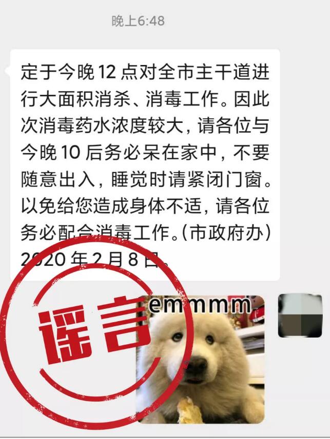 2月8日,有人在微信群傳播消息稱:今晚12點(diǎn),重慶市主干道將進(jìn)行大面積消殺消毒工作,今晚10點(diǎn),居民不得出門,睡覺時需緊閉門窗。對此,經(jīng)向城管部門核實(shí),我市未安排該項(xiàng)工作。提醒大家不信謠、不傳謠,疫情防控工作請以政府部門公告和權(quán)威媒體報道為準(zhǔn)。