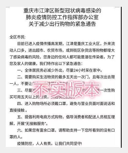 謠言3:《江津區(qū)新型冠狀病毒感染的肺炎疫情防控工作指揮部辦公室關(guān)于減少出行購物的緊急通告》文件公布