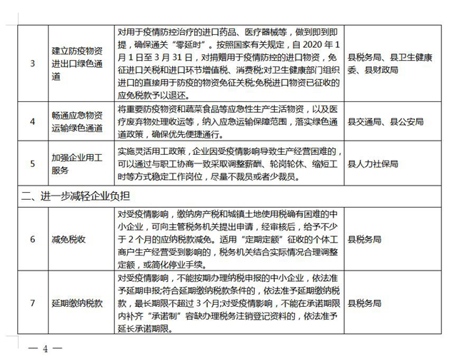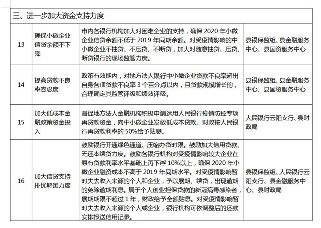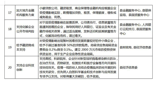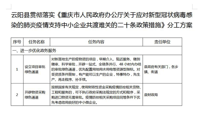 《云陽縣貫徹落實〈重慶市人民政府辦公廳關于應對新型冠狀病毒感染的肺炎疫情支持中小企業共渡難關的二十條政策措施〉分工方案》,已經縣政府同意,現印發給你們。請各單位根據職能職責,主動對接市級部門,認真研究細化各項政策措施,切實抓好各項政策措施落地落實。