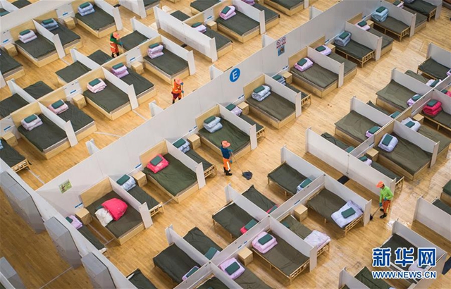 2月12日,在武漢體育中心方艙醫(yī)院,工人在進行整理和清潔工作(無人機照片)。 新華社記者 肖藝九 攝