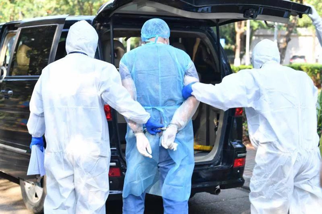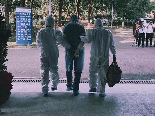 ▲2月15日下午,海南省東方市新冠肺炎確診患者張某智在海南省傳染病醫院治愈出院,因涉嫌以危險方法危害公共安全罪被東方市公安局依法采取強制措施。(海南省傳染病醫院供圖)