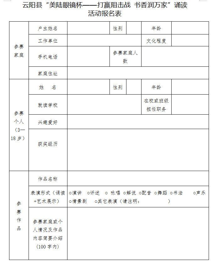 活動分為家庭參賽和個人參賽兩種形式。家庭參賽對象為云陽縣常住家庭,參與家庭至少推選2名家庭成員參加,且其中至少1名為18周歲以下的未成年人。個人參賽對象為云陽縣3至17歲青少年兒童,可單獨或組隊參賽。參賽人員需錄制參賽視頻,時長為1~3分鐘,分辨率480P以上,畫質清晰,MP4格式,作品名稱為“姓名+誦讀作品名稱+聯(lián)系電話”,并附上電子版報名表和1 張參賽作者家庭生活照,發(fā)送至郵箱mengyuanma@zxllet.com進行投稿,投稿聯(lián)系人:馬夢媛,電話:18323127261。