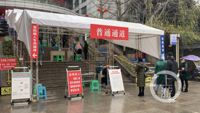 2月19日,上游新聞·重慶晨報記者在南川區人民醫院看到,該院入院前的幾十步臺階,被分成了四個通道口,發熱病人專用通道一個,其他病人通道兩個,工作人員通道一人。