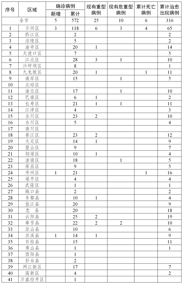 新增確診病例中,萬(wàn)州區(qū)3例、開(kāi)州區(qū)1例、巫溪縣1例;新增治愈出院病例中,萬(wàn)州區(qū)9例、江北區(qū)1例、九龍坡區(qū)1例、渝北區(qū)1例、合川區(qū)2例、綦江區(qū)1例、開(kāi)州區(qū)1例、石柱縣1例。
