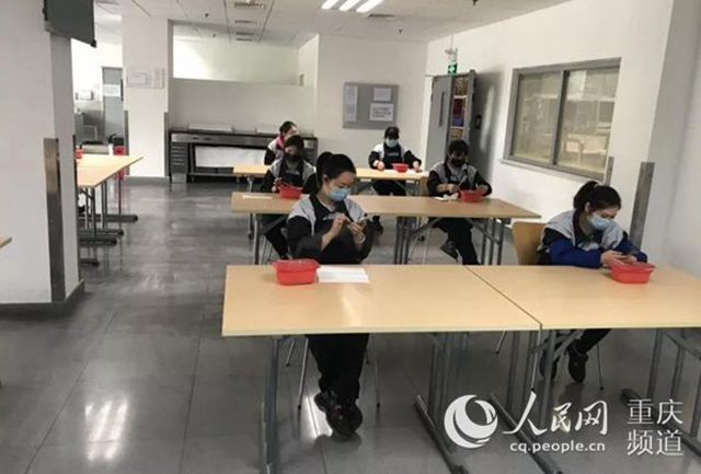復工復產后員工必須分開就餐,圖為重慶博澤汽車部件有限公司。重慶高新區供圖