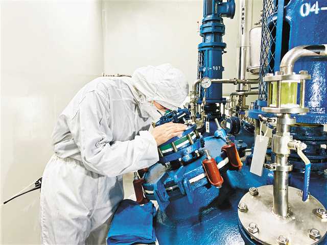 2月24日,位于重慶長(zhǎng)壽區(qū)的康樂(lè)制藥有限公司,工作人員正在生產(chǎn)線工作。該公司在做好疫情防控的前提下,于2月4日逐步復(fù)工,加緊生產(chǎn)防疫藥品磷酸氯喹。記者 齊嵐森 攝