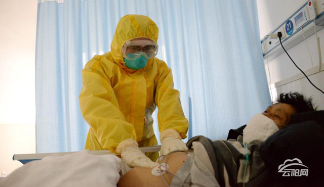N95口罩、隔離服、護(hù)目鏡、防護(hù)帽、防護(hù)手套和過(guò)膝的水鞋是進(jìn)入隔離病房的標(biāo)配,這身防護(hù)笨重且又不透氣。穿過(guò)內(nèi)走廊、緩沖間,層層“突破”,進(jìn)入病房,每次不僅是空間的突破,更是心理的突破。丁功偉從未因此而減少進(jìn)隔離病房的次數(shù),只要患者稍有病情變化、情緒有波動(dòng)他都會(huì)第一時(shí)間出現(xiàn)在患者身邊。由于防護(hù)物資緊缺,為了減少工作人員進(jìn)出,他每次進(jìn)去查房,都主動(dòng)承擔(dān)起為患者送飯、送藥、送水等工作。每當(dāng)他脫下防護(hù)服,汗水就從發(fā)梢滴落,里面的衣服完全濕透。他對(duì)同事們說(shuō),這些病人不僅渴望得到有效的治療,他們更需要消除孤獨(dú)和恐懼,我們要多一些精心呵護(hù)。