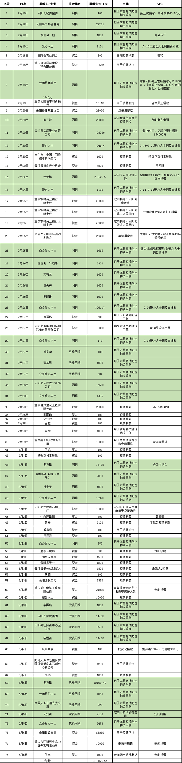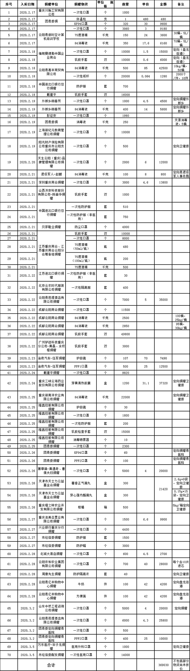 自2020年1月新型冠狀肺炎疫情爆發(fā)以來,自2月17日16時(shí)到3月5日16時(shí),云陽縣慈善會(huì)共匯總接受各方面援助我縣抗擊新冠肺炎疫情的物資和資金1090799.56元,其中物資369030元(不包括部分物資尚未折價(jià))。現(xiàn)公示如下: