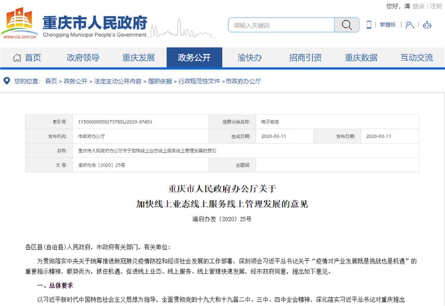 3月11日,重慶市政府網(wǎng)發(fā)布《重慶市人民政府辦公廳關(guān)于加快線上業(yè)態(tài)線上服務(wù)線上管理發(fā)展的意見》(后簡稱“意見”)。