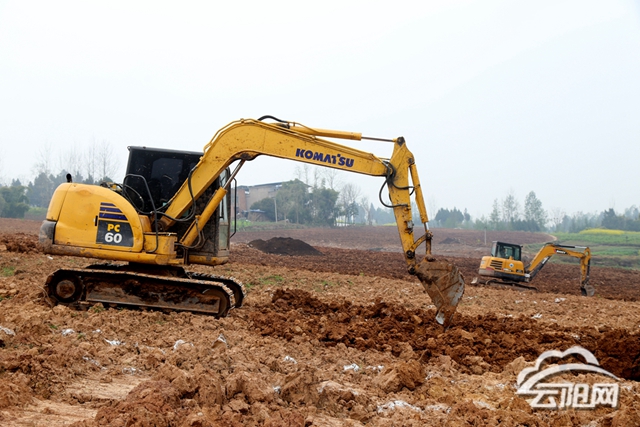 在陽鳳村一畝良園農業發展有限公司的果園內,幾臺挖掘機正在作業,工作人員正在劃線,為引進李子樹做規劃。