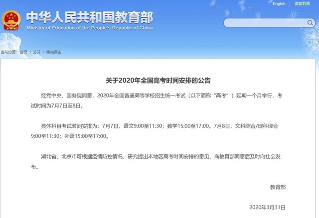 1.【云陽家長注意:今年高考延期一個(gè)月】3月31日,教育部發(fā)布《關(guān)于2020年全國高考時(shí)間安排的公告》。2020年全國普通高等學(xué)校招生統(tǒng)一考試延期一個(gè)月舉行,考試時(shí)間為7月7日至8日。(向心理引導(dǎo),加油鼓勁方向說)(來源:愛云陽)