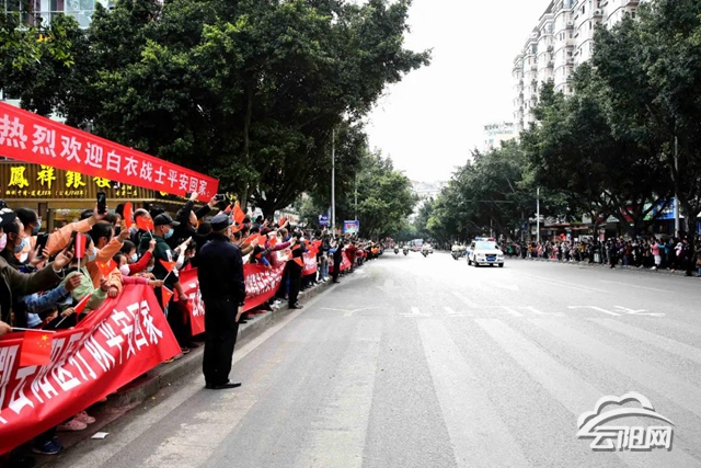 “熱烈歡迎云陽援湖北醫療隊凱旋!”“致敬白衣天使,致敬最美逆行者!”“最美白衣天使,云陽人民的驕傲!”返城路上,市民自發守候在道路兩旁,一邊向英雄揮手致敬、鼓掌,一邊高喊著“歡迎回家”的口號,表達對英雄的尊敬與感謝。