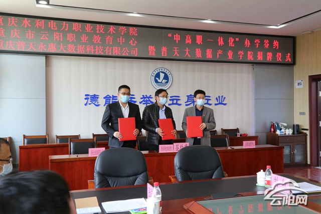 云陽網(wǎng)訊(記者 劉太興)4月12日,“中高職一體化”辦學(xué)簽約暨普天大數(shù)據(jù)產(chǎn)業(yè)學(xué)院揭牌儀式在云陽職教中心舉行。