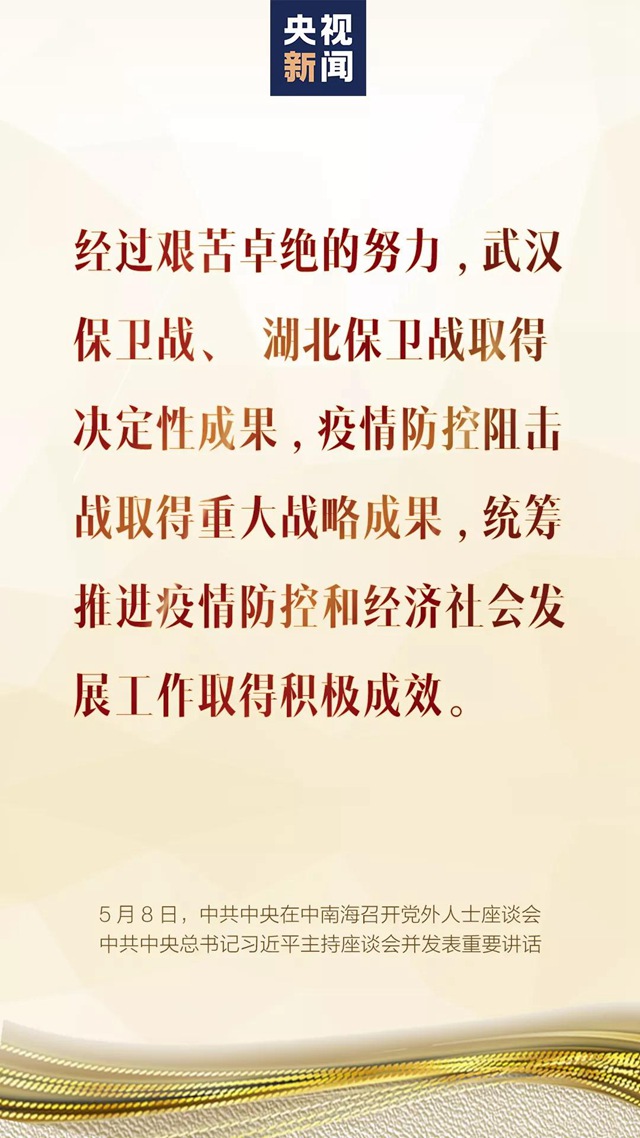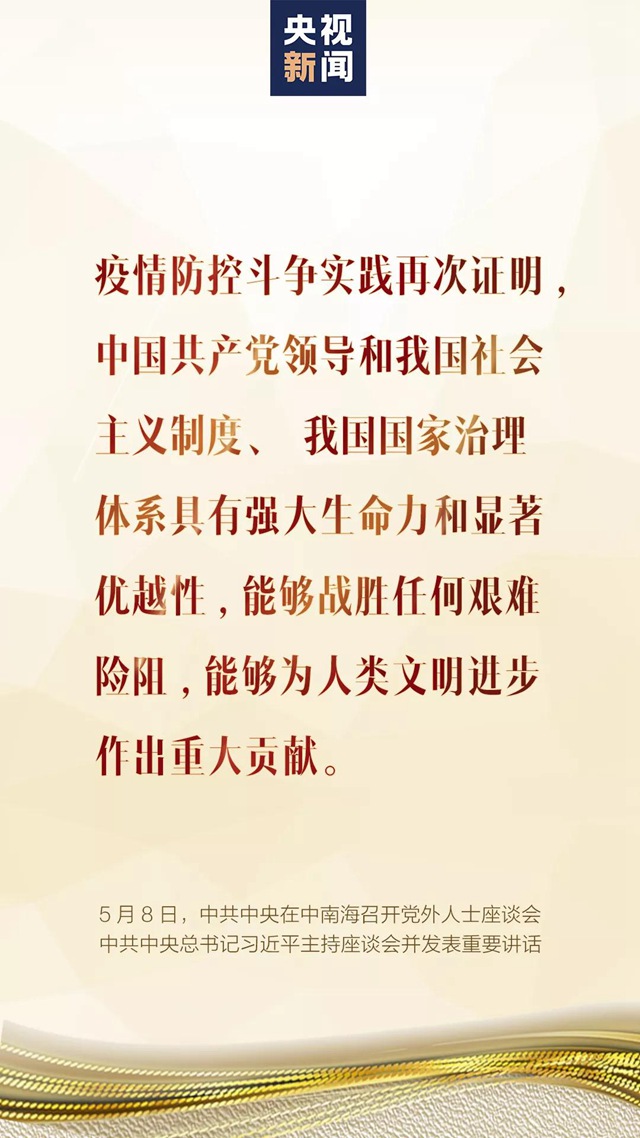 5月8日,中共中央在中南海召開(kāi)黨外人士座談會(huì),就新冠肺炎疫情防控工作聽(tīng)取各民主黨派中央、全國(guó)工商聯(lián)和無(wú)黨派人士代表的意見(jiàn)和建議。中共中央總書記習(xí)近平主持座談會(huì)并發(fā)表重要講話。
