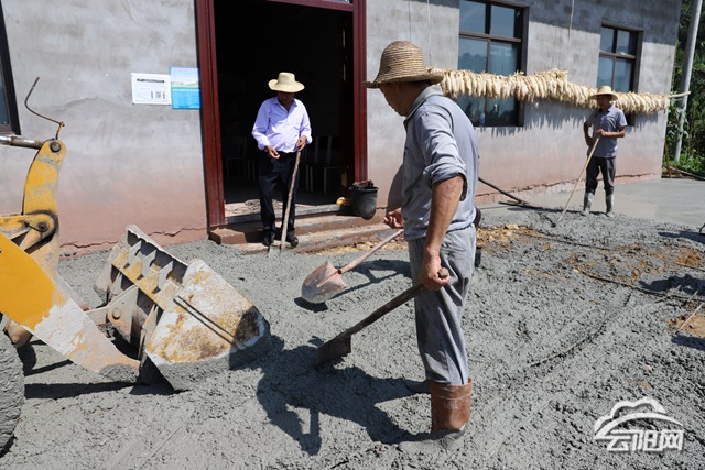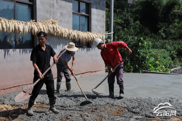 記者在李登成家院壩看到,一輛小型鏟車把混凝土運往院壩,卸下后,幫扶干部和黨員群眾開始平整地基、硬化地面,院壩硬化區(qū)變得平整光滑。