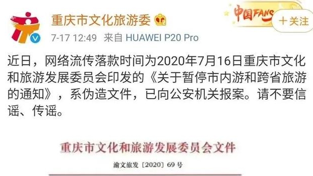 這個消息嚇到了很多有暑期出行計劃的重慶人。不過,請各位放心,這是假消息!@重慶市文化旅游委 17日發布消息,確認此文件系偽造文件,已向公安機關報案。請不要信謠、傳謠。