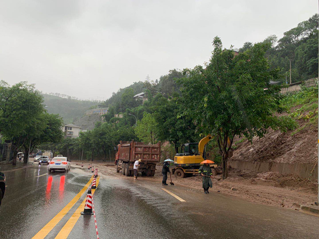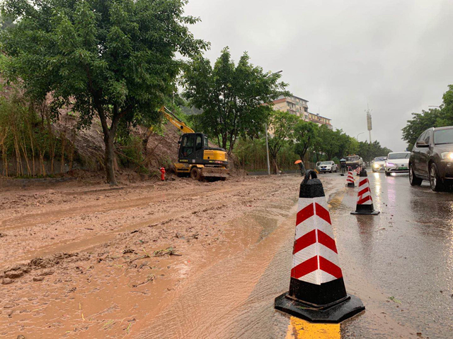 在稻香路,挖掘機和工人們正冒雨排危搶險。此處受災點是于18日凌晨2:00發生大面積邊坡垮塌,幾百方泥石將道路完全阻斷。記者在現場看到,經過連夜搶險作業,現場道路已恢復單邊通行。“我們連夜組織人員調集一臺挖掘機、四臺車輛連夜進行搶險,下一步我們要繼續清理,再用環衛車進行清洗?!笨h市政設施管理所副所長曾勇介紹現場情況。