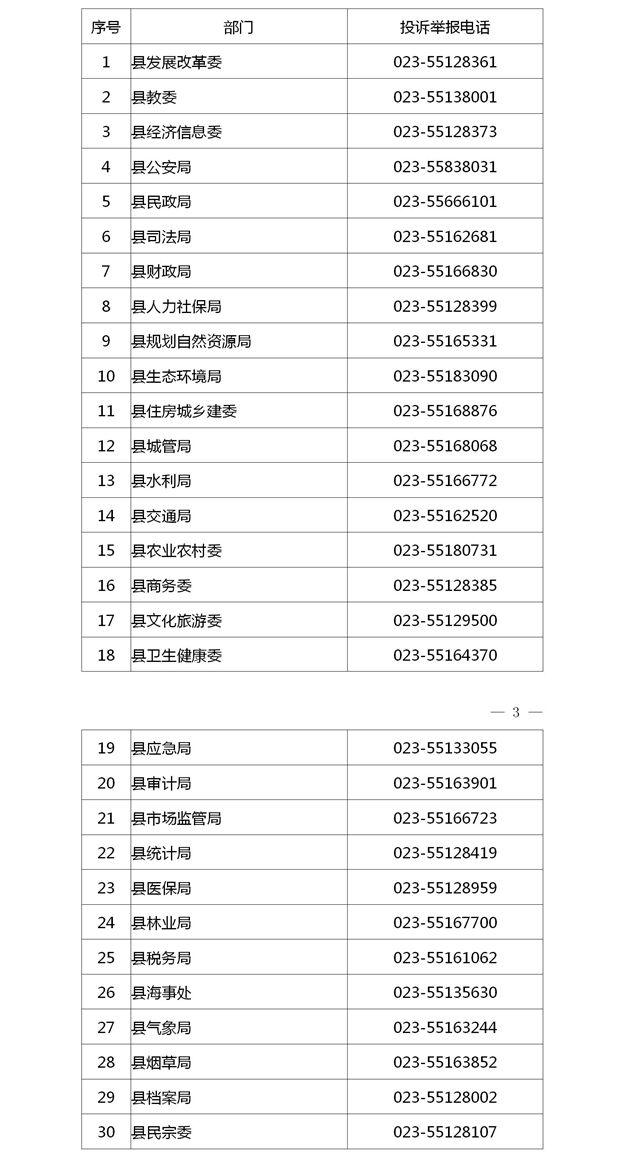 縣政府監督投訴舉報電話設立在縣司法局,監督投訴舉報電話:023-55818528。各行政執法機關監督投訴電話如下表:
