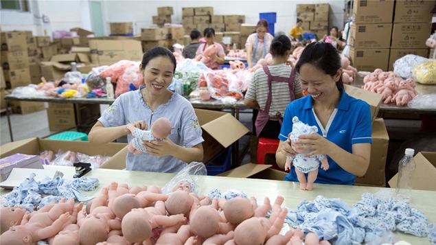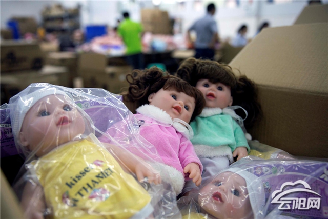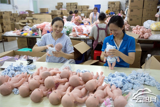 7月31日,工人在高陽鎮(zhèn)返鄉(xiāng)創(chuàng)業(yè)園優(yōu)多科技有限公司給玩具娃娃完成穿衣服、包裝等工序。