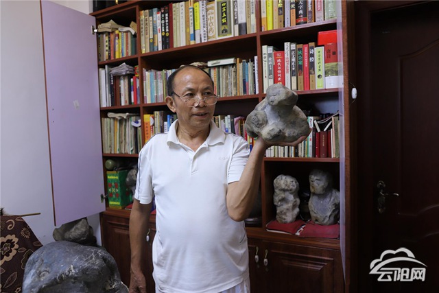 走進老人的屋子,不足10平方米的客廳里,除書架上面列滿了醫(yī)書古籍外,在書籍下方及屋子其他角落都擺放著他引以為豪的大大小小、不計其數(shù)的奇石。張飛頭像石、哪吒鬧海石、烏龜石、鷹頭石……這里的每一塊石頭都是老人從長江邊、河壩邊搬回來。