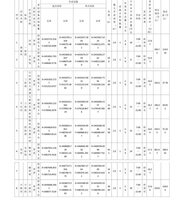 標(biāo)的系云陽縣洞溪河、千丘河、雙河、小溪溝4條河流6個標(biāo)段8個開采區(qū)6年河道砂石資源開采權(quán)。出讓期限為2020年9月1日至2021年2月28日、2021年7月1日至2022年2月28日、2022年7月1日至2023年2月28日、2023年7月1日至2024年2月29日、2024年7月1日至2025年2月28日、2025年7月1日至2025年12月31日,每年3月1日至6月30日為禁采期。擬按標(biāo)段現(xiàn)狀以不低于轉(zhuǎn)讓底價協(xié)議或競價方式分零出讓,詳情如下: