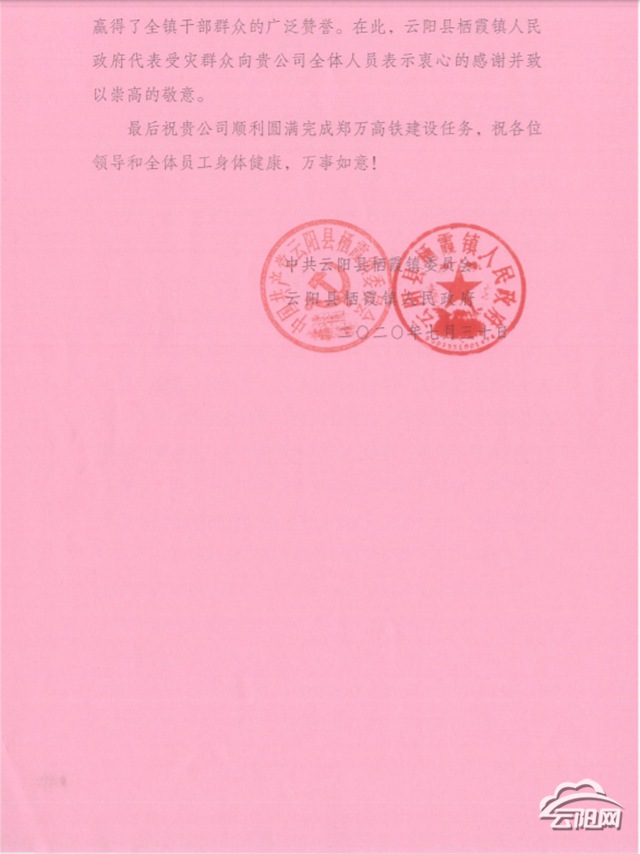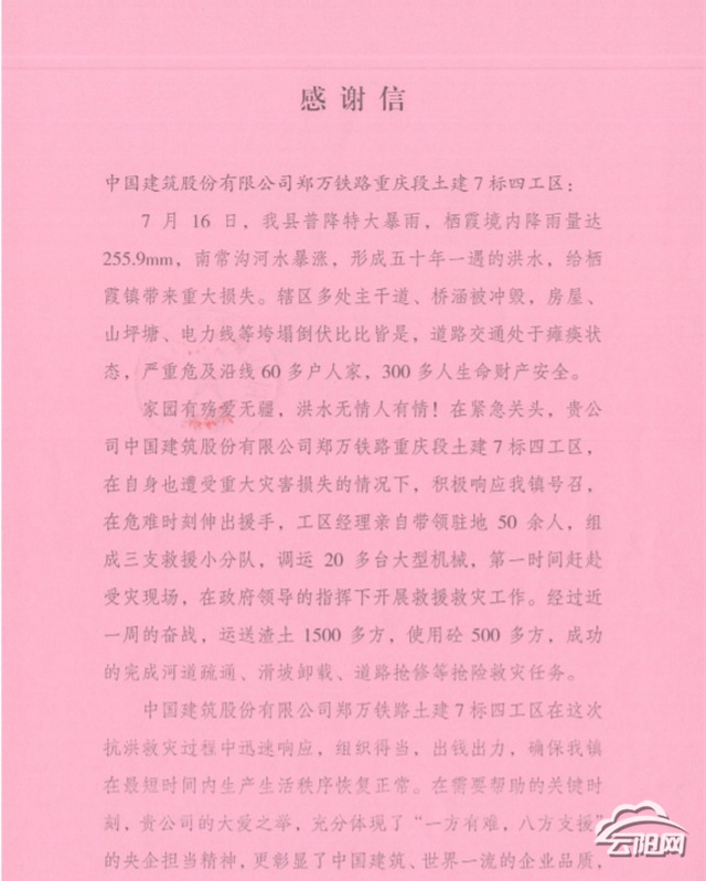 云陽網訊(通訊員 孔立梅)8月6日,鄭萬鐵路重慶段土建七標四工區收到來自棲霞鎮贈送的錦旗。棲霞鎮此舉是為感謝四工區在上月對棲霞鎮抗洪搶險的莫大幫助。