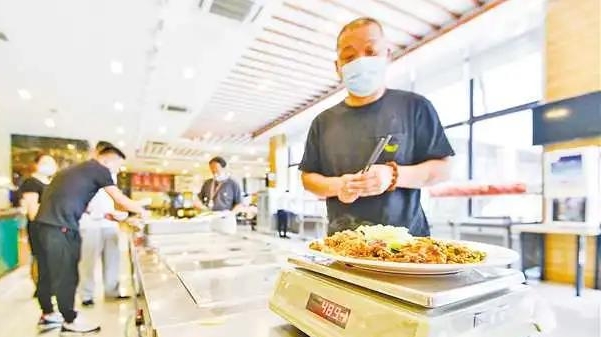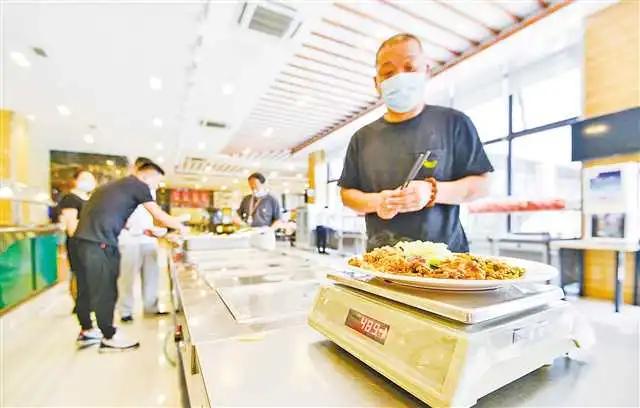 與北區食堂不同,南區食堂采取了“稱重收費”的方式杜絕浪費。前來就餐的員工排隊自助取餐,隨后統一到窗口處稱重,根據餐食重量付費。